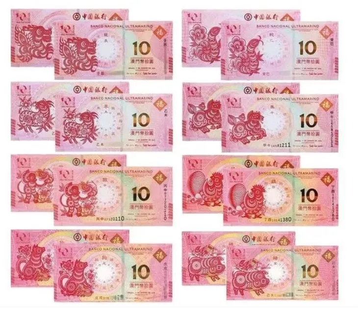 澳门生肖 钞从 2012 年起开始发行,至今已经发行了龙、蛇、马、羊、猴、鸡、狗、猪8 个生肖。澳门钞单张面值 10 澳门元,每套两张,分别由中国银行和大西洋银行发行,所以也被称为生肖对钞。
